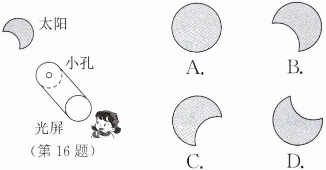 16. 如图所示,小华借助小孔成像实验装置对“”形太阳进行观察,纸盒上扎有圆形小孔,则她在半透明光屏上看到的像的形状是( )