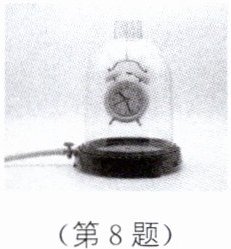 8. ★实验推理法 (2024·无锡)如图所示,将正在响铃的闹钟悬挂在与抽气机相连的密闭玻璃罩内,听到的声音是闹钟 产生的。用抽气机抽气,听到的铃声越来越小,由此推测,声音不能在 中传播。