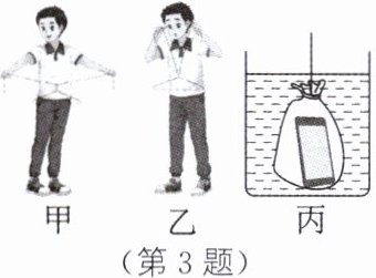 3. 小明做了如图甲、乙所示的两个实验,图甲实验中,敲击衣架发声,耳朵听到的声音主要是通过 传入小明耳朵的;图乙实验中,把绕线的两根手指紧压在耳朵上,敲击衣架,可以听到更大的声音,此时耳朵听到的声音主要是通过 传入人耳的;在图丙实验中,仍能听到水中手机的铃声,说明水可以传播声音。由以上三个实验可以总结得出:声音可以在 、 、 中传播。