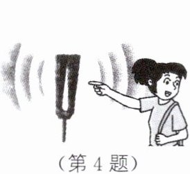 4. 如图所示,音叉振动发出声音,声音通过空气传播。当发声的音叉的叉股向外侧振动时,压缩附近的空气,使这部分空气变 (疏/密);当叉股向内侧振动时,外侧的空气又变 (疏/密)。随着音叉的不停振动,在空气中形成 相间的波动。波动传进人耳,引起鼓膜的 ,人就听到声音。声音是一种波,叫作 波。