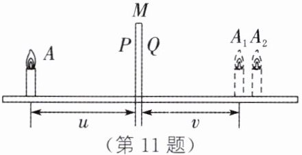 11. 露露用一块较厚的玻璃板M来探究平面镜的成像特点,如图所示,图中像$A_1$与像$A_2$是一次实验中同时看到的两个像,它们的大小$ (A_1$较大/相等$/A_2$较大),其中$A_1$是蜡烛通过玻璃板的P面所成的像。露露按照图中的测量方法,测得u= 4.2cm,v= 3.9cm,可以推算像$A_1$与像$A_2$之间的距离为 cm。
