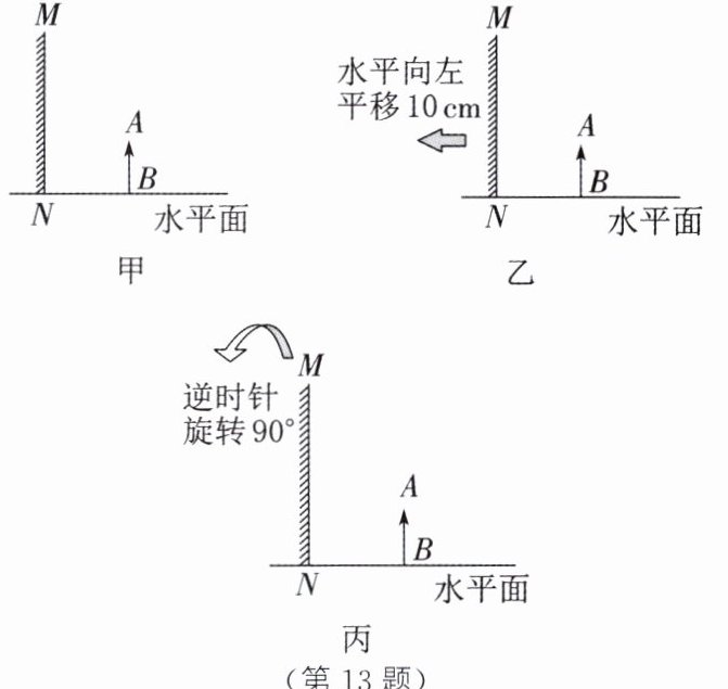 (1)如图甲,物体AB和平面镜MN都竖直放置在水平面上,AB与MN之间的水平距离为20cm。现保持AB不动,将MN水平向左平移10cm,如图乙,则AB的像会水平向 (左/右)平移 cm。