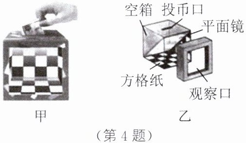 4. 如图甲所示,魔术师用器材自制了一个“储币魔箱”,他将一个只有一面开口的空箱面向观众,将纸币从“储币魔箱”顶部的投币口投入,结果纸币竟不翼而飞。如图乙所示,制作“储币魔箱”时,平面镜与箱底成 (30°/45°/60°)角放置,“储币魔箱”底部在平面镜中所成的像恰好在平面镜的 (侧面/背面/顶部),同样地,“储币魔箱”的侧面也有一半被平面镜遮挡,而未被遮挡的前一半所成的像恰好在观察口,使前面的观众误认为看见了整个“储币魔箱”。