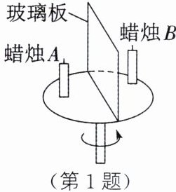 1. 在校园科技节活动中,小明观看了“隔着玻璃吹蜡烛”的魔术。如图所示,表演者旋转平台,使玻璃板一侧靠近观众,用两个打火机同时“点燃”两支蜡烛,在玻璃板正对观众的一侧吹蜡烛 A,观众看到两支蜡烛同时被“吹灭”。观众看到两支蜡烛同时被“吹灭”,这是因为蜡烛 B 并未被点燃,观众看到的只是蜡烛 A 的烛焰通过玻璃板所成的 (实/虚)像;要完成此魔术,两支蜡烛应选择形状和大小 (相同/不同)的。