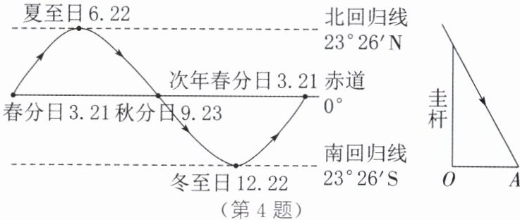 (3)2021年3月14日,太阳直射点接近赤道,2021年6月20日,太阳直射点接近北回归线,所以对于北回归线以北的宁波地区,2021年6月20日正午时刻太阳的高度角更大,同一圭杆的杆影更短。