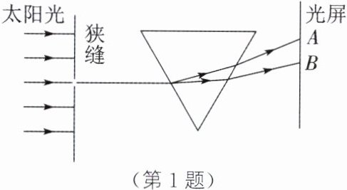 1. ______(填人名)在1666年做的光的色散实验,揭开了颜色之谜,他让一束太阳光穿过狭缝,在三棱镜另一侧的光屏上可以看到一条彩色的光带,如图所示,A处是______光,若实验时彩色光带分辨不清,可以适当______(增大/减小)光屏与三棱镜的距离。