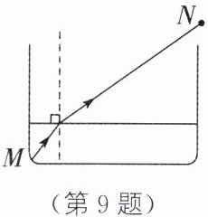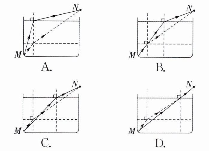9. 如图所示为小明的眼睛在N点看到鱼缸内M点处鹅卵石的光路图。往鱼缸内注入更多水后,小明的眼睛在N点仍然可以看到鹅卵石。选项图中带箭头的虚线代表原来的光路,能正确反映水变多后小明看到鹅卵石的光路图的是( )