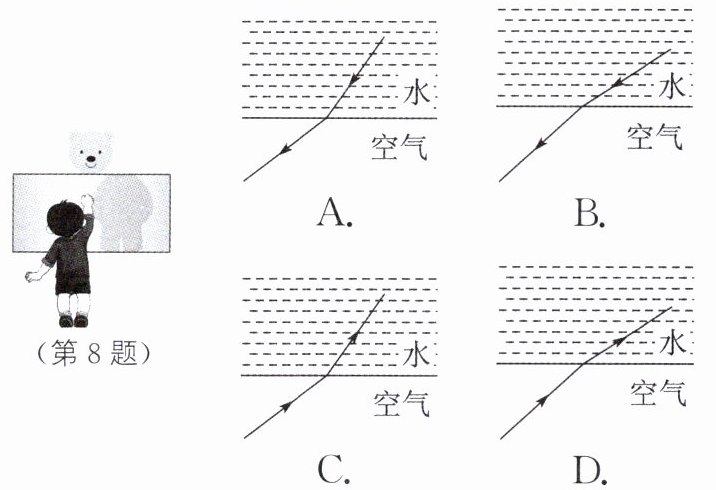 8. (2023·常州)海洋公园内,北极熊站立在方形透明水族箱内,头在水面上、身体在水面下。水族箱外的游客居然看到了北极熊“身首异处”的奇异场景,如图所示。游客看到北极熊身体的光路图是( )