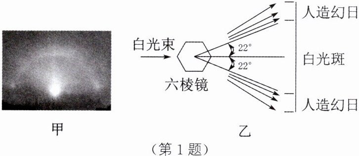 1. 新情境·自然奇观 2024年12月10日,在北京上空惊现“三个太阳”的奇观,如图甲所示。如图乙所示为其成像原理图。专家解释说,在天空高层的半透明薄云里有许多六棱柱状的冰晶体,有时候它们会整整齐齐地垂直排列在空中,当太阳光射在这些六角形冰柱上就会发生非常规律的______现象,周围看起来就像出现了多个太阳,较小的“太阳”实际上是太阳的______(实/虚)像。