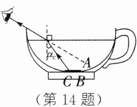 14. 如图所示,在“观看水中的硬币”活动中,把一枚硬币固定在空杯的底部,找一个角度使你刚好看不到硬币的最右端A点。保持眼睛和杯子的位置不变,在同学逐渐把水加入杯中的过程中,硬币上的B点和C点能先后被你看到。
