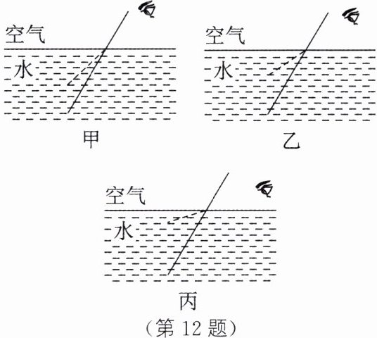 12. 小明同学在家中进行光的折射课外拓展实验。实验过程中他发现同样斜插入水中的筷子,从不同角度(眼睛与水平面的夹角)观察到筷子的“折断”程度不同,分别如图甲、乙、丙所示。