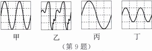 9. 下列图像为录制合成的声音波形图,由图可知,甲和丙的______相同,甲和丁的______相同。(音调/响度)