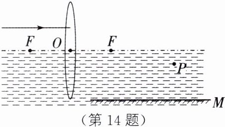 14. (2023·凉山)如图所示,凸透镜的主光轴与水面重合,F是凸透镜的焦点,水下有一块平面镜M,一束与水面平行的光经凸透镜折射后进入水中,再经水中的平面镜反射后恰好经过P点,请将光路图补充完整。
