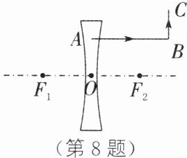 8. (2024·凉山)与主光轴平行的光线AB是凹透镜的一条折射光线,经过平面镜反射后的反射光线为BC,请画出折射光线AB的入射光线及平面镜的位置。