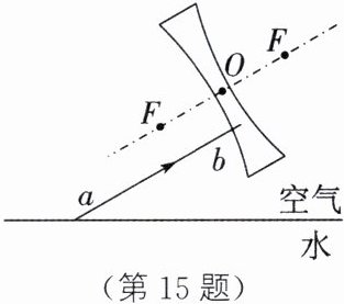 15. 如图所示,由水中射出一束光ab照射到凹透镜上,该光束与凹透镜的主光轴平行(F为凹透镜的焦点,O为光心)。请画出ab光束在水中的入射光线和通过凹透镜后的折射光线。