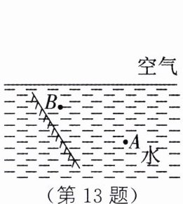 13. 如图所示,A是水中的一个发光点,从A发出的一束光经平面镜反射后,反射光线通过B点,并在水面处发生折射。请画出入射光线、反射光线和折射光线的大致方向。