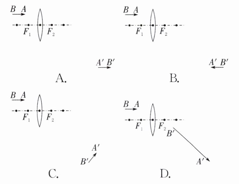 9.$F_{1}$、$F_{2}$是凸透镜的焦点,AB是放在凸透镜前的物体,$A'B'$是AB经凸透镜所成的像。下列四个图中,其中关于AB所成像的情况正确的是(仅需考虑$A'B'$的位置)( )