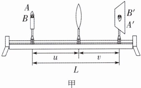 4f 1.5f 解析:凸透镜成实像时,满足u>f,由图乙可知,随着物距u增大,物像间距L先减小后增大,当物距为2f时,物像间距最小为4f,因此,要想成实像,蜡烛与光屏的间距应满足L≥4f;由图乙知,当u=1.5f时,L=4.5f,v=L - u=4.5f - 1.5f=3f,此时放大率n=A'B'/AB=v/u=3f/1.5f=2,由光路的可逆性可知,当u'=3f、v'=1.5f时,放大率n'=A₁'B₁'/A₁B₁=v'/u'=1.5f/3f=0.5,因此当n由2变为0.5时,物距u由1.5f变为3f,则凸透镜移动的距离为1.5f。