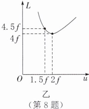 8. 如图甲所示,将凸透镜及蜡烛、光屏置于光具座上做成像实验,保持蜡烛不动,移动凸透镜和光屏,记录每次成实像的物距$u$、像距$v$、物像间距$L(L= u+v)$,绘出如图乙所示的$L-u$图像(以$f$为长度单位)。由图可知,要想成实像,蜡烛与光屏的间距应满足$L\geqslant$______。在物理学中,放大率是指像的大小与物体大小的比值,即放大率$n= \frac{A'B'}{AB}= \frac{v}{u}$。结合甲、乙两图可知,当$n$由2变为0.5时,凸透镜移动的距离为______。(用$f$表示)