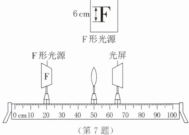 7.(2024·贵州)如图所示,用焦距为10 cm的凸透镜、高度为6 cm的F形光源、光屏和光具座等器材探究凸透镜成像大小的变化规律,通过测量像的高度反映像的大小。