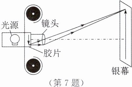 7. 如图所示,小明利用凸透镜成像原理来研究电影放映时银幕上的影像情况。