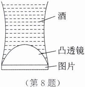 8. 新情境·科技民生 如图所示为一种被称为“七仙女”的神奇玻璃酒杯,空杯时什么也看不见,斟上酒,杯底立即显现出栩栩如生的仙女图。下列对仙女图形成原因的探讨,正确的是( )