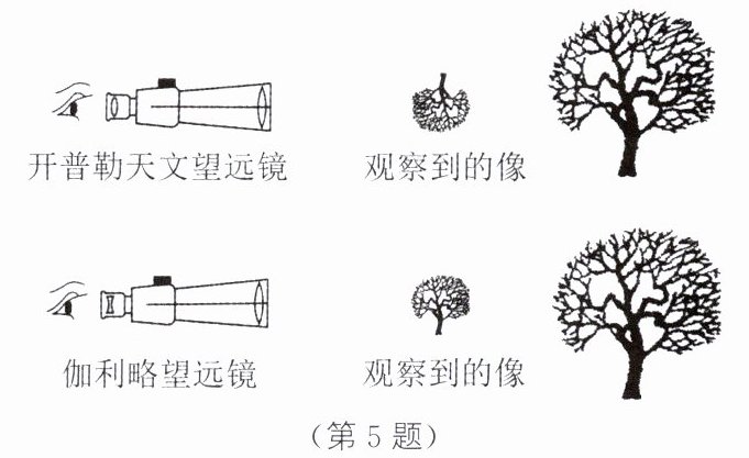 5. 简单的折射望远镜分为两种类型:用凸透镜作目镜的称为开普勒天文望远镜,用凹透镜作目镜的称为伽利略望远镜,它们的共同点是用凸透镜作物镜。如图所示为用两种望远镜观察远处物体的示意图。