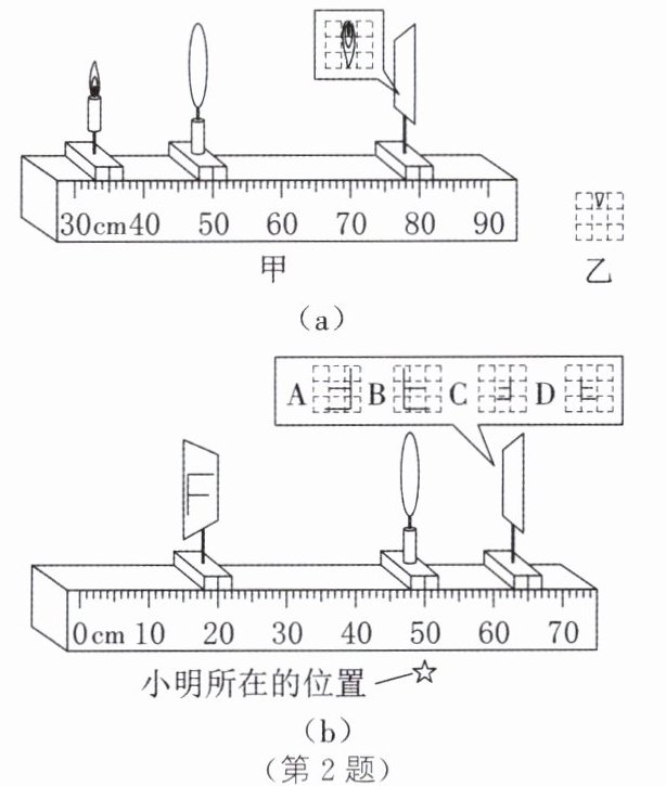 2.(2023·广东)小明在学习了凸透镜成像的规律后,继续深入探究。选用表中某一规格的凸透镜做实验,调整好器材后如图(a)中甲所示,此时烛焰在光屏上成放大的像。