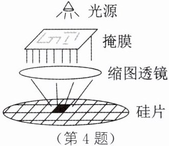 4. 新情境·科技民生 光刻技术是利用缩图透镜将绘在掩膜上的电路图通过光源投射到涂有光刻胶的硅片上,在硅片上成像越小,芯片的制程也越小。由原理图可知,掩膜在硅片上成 (填像的性质)像,缩图透镜的焦点在硅片的 (上方/下方);如果芯片的制程从90 nm升级到22 nm,保持缩图透镜相同,那么要将掩膜向 (上方/下方)移动。