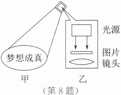 8. 新情境·科技民生(2024·苏州)如图甲所示为公共场所的宣传投影灯,装在高处的投影灯照在地面上出现图案,其内部结构如图乙所示。下列说法中,正确的是 ( )