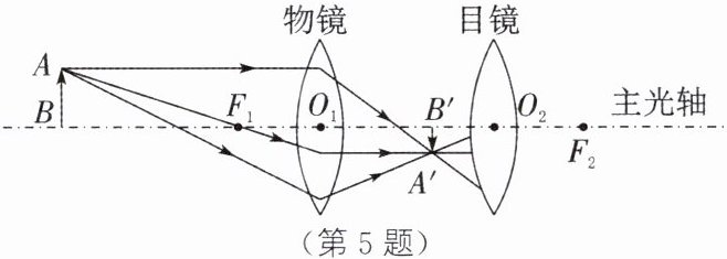 5. 如图所示为一种望远镜内部部分光路图,物镜和目镜都是凸透镜$,O_1$为物镜光心$,F_1$为物镜焦点$,O_2$为目镜的光心$,F_2$为目镜焦点。