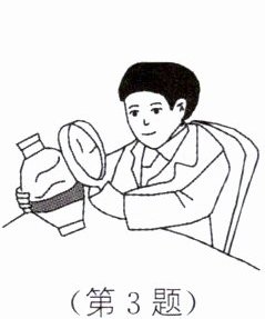 3. 如图所示,鉴定文物时,常用放大镜观察文物的细微部分,这时他看到的像是 。如果在文物上有两条裂纹,其夹角是5°,要想使看到的像更大,应该将放大镜离裂纹 。若放大镜的放大倍数是6,则他看到的两条裂纹的夹角是 。
