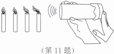 11. 如图所示,取一饮料罐,在其底部开一个孔(直径为5cm),去掉盖子,蒙上一张牛皮纸。在桌子上沿一直线每隔5cm放置几支点燃的蜡烛。用手不断敲击纸膜,会看到蜡烛火焰由近及远逐一被“吹斜”。此实验生动地证明了声音在向前传播的过程中,减小的是( )