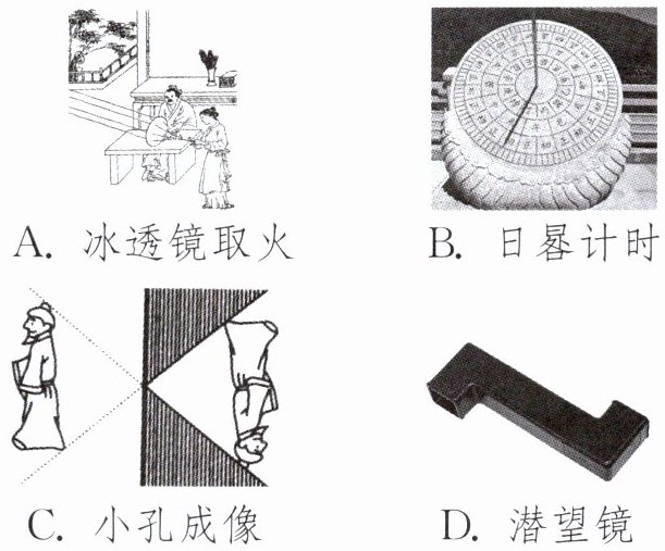 D 解析:水中的倒影是平面镜成像现象,是由光的反射形成的;冰透镜取火是光的折射现象,故A错误;日晷计时是利用影子的方向大致判断时刻,影子是由光的直线传播形成的,故B错误;小孔成像利用了光的直线传播原理,故C错误;潜望镜利用了光的反射,故D正确。