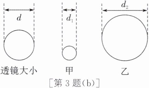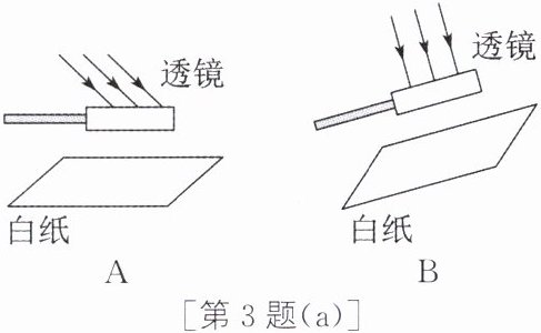 3. 如图(a)所示,小明为辨别直径相同的两个透镜的类型,分别将它们正对太阳,把一张白纸放在透镜下方,在白纸上得到相应的光斑,其操作正确的是 (A/B)。