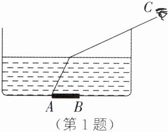 解析:小明刚好看到水中杯底硬币的A端,说明A点射向水面的光线折射后进入人的眼睛,通过B点作A的入射光线的平行线,该平行线为入射光线,与之前折射光线的交点所在水平线为刚看到硬币的B端时水面的位置。