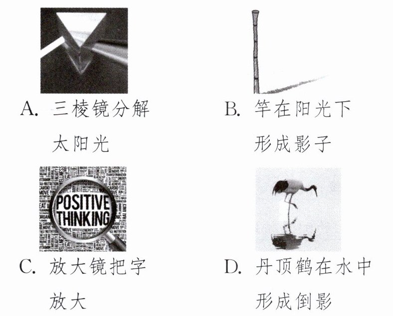 D 解析:意大利激光角反射器通过反射激光进行精准的测量定位,其原理是光的反射。三棱镜分解太阳光是光的色散现象,属于光的折射,故A不符合题意;竿在阳光下形成影子是光的直线传播形成的,故B不符合题意;放大镜把字放大是凸透镜成像,属于光的折射,故C不符合题意;丹顶鹤在水中形成倒影是平面镜成像,属于光的反射,故D符合题意。