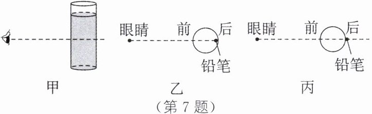 7.(2023·扬州)如图甲所示,在装有水的杯子里,小红将一支铅笔分别紧贴杯壁内、外竖直放置,两次都观察到铅笔放大的像,俯视图如图乙、丙所示,下列说法中,正确的是( )