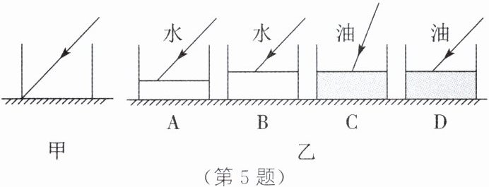 5. 为了探究水和油谁对光的偏折本领更强,小明提出如下实验方案:先让光从空气直接斜射到透明的空容器中,记下光斑的位置,如图甲所示;接着先后倒入水和油,重做上述实验,记录对应的光斑位置;然后根据光斑位置的变化得到结论。经过讨论,同学们认为这一方案可行,于是进行了实验。