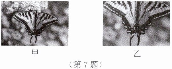 7. 小李先后用同一相机拍摄了同一蝴蝶休憩的照片甲和乙,则拍摄 照片时距离蝴蝶近;若他用不同焦距的相机在与同一蝴蝶相距相同距离的位置拍摄了照片甲、乙,则拍摄 照片时所用的相机焦距大。(甲/乙)