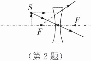 2. 如图所示,一支点燃的蜡烛(图中用箭头表示)直立于凹透镜的主光轴上,图中已画出由烛焰的顶端S射出的两条特殊光线及其对应的折射光线。据图可知( )