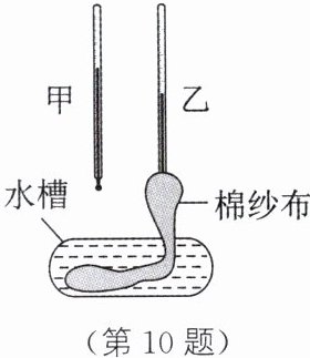 10. 有一种能反映空气中水蒸气含量(空气湿度)的装置,叫作干湿泡湿度计,如图所示,它是由甲、乙两支相同的温度计并列组成的,其中乙的玻璃泡上包着湿棉纱布,甲是干燥的。我们发现 (甲/乙)温度计的示数要低一些,这是因为 。在一定的温度下,两支温度计的示数差别越小,就表示空气的湿度越 (大/小)。