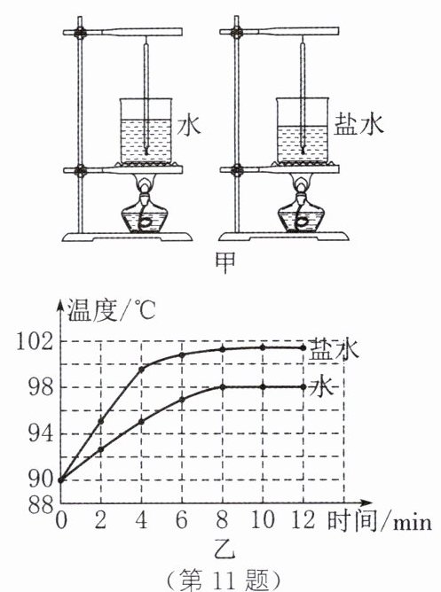 11.(2024·福建)探究液体在沸腾前后温度变化的特点,实验装置如图甲所示。取质量相等的水和盐水分别放入两个相同的烧杯中,用相同的酒精灯同时加热,根据实验数据,绘制温度随时间变化的图像,如图乙所示。