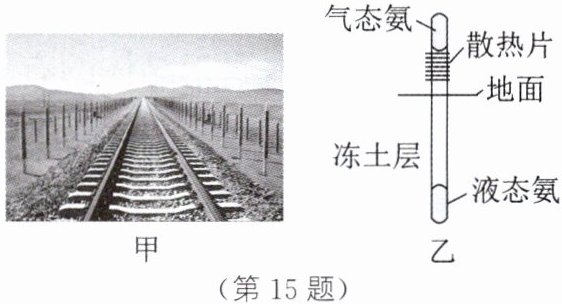 15. 新情境·科技民生 (2024·包头)我国的青藏铁路是世界上海拔最高的铁路。在冻土区的铁路两侧安装有许多热棒,如图甲所示。热棒是封闭的中空长棒,上端装有散热片,下端插在冻土中,里面填充低沸点的液态氨作为“制冷剂”,如图乙所示。液态氨通过与气态氨的相互转化过程,带走冻土层的热量,使冻土层保持低温,保护路基。请根据以上信息回答下列问题。