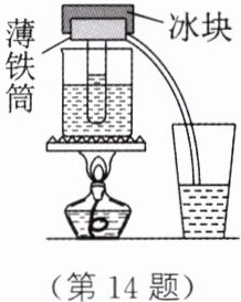 14. 如图所示为小雨和小明在科技活动中设计的用于提纯酒精的装置。在烧杯中盛水,试管中放未提纯的酒精(含水和杂质),薄铁筒上方放冰块。该装置采用“水浴法”进行加热,可以确保当试管中的酒精沸腾时,试管中的水不会沸腾,因此该装置提纯酒精的原理是利用了酒精和水的______不同;冰块的作用是可以使______更易液化。