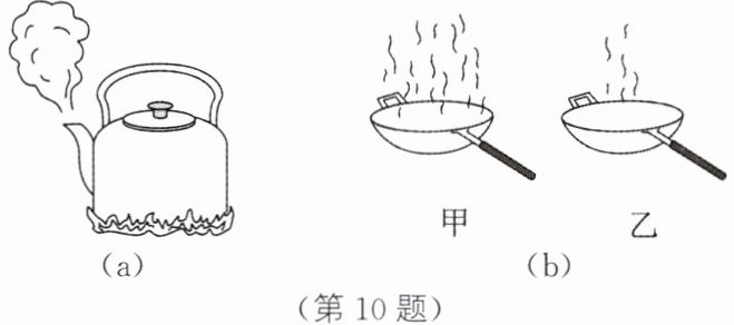 10. 易错题 小明在厨房中发现:壶里的水烧开以后,壶嘴上方冒出一团团“白气”。这些“白气”实质上是一些______,通常烧水时人们会发现靠近壶嘴的地方什么也看不见,离开壶嘴一段距离才看到“白气”,如图(a)所示,这是因为______。冬天在炉子上烧菜的时候,出锅前、后一瞬间会出现如图(b)所示的甲、乙两种情景,根据分析,你可以确定______(甲/乙)是火焰熄灭后的图片。