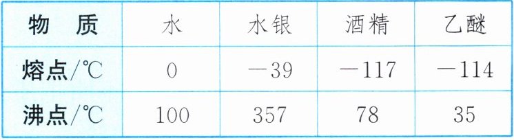 B 解析:我国有的地区气温低于水银的凝固点$-39^{\circ }C$,A、C错误;很多地区夏季的气温超过$35^{\circ }C$,D错误;我国各个地区气温最高不会超过$78^{\circ }C$,最低不会低于$-117^{\circ }C$。酒精在我国各个地区都不会凝固成固态,也不会沸腾变成气态,B正确。
