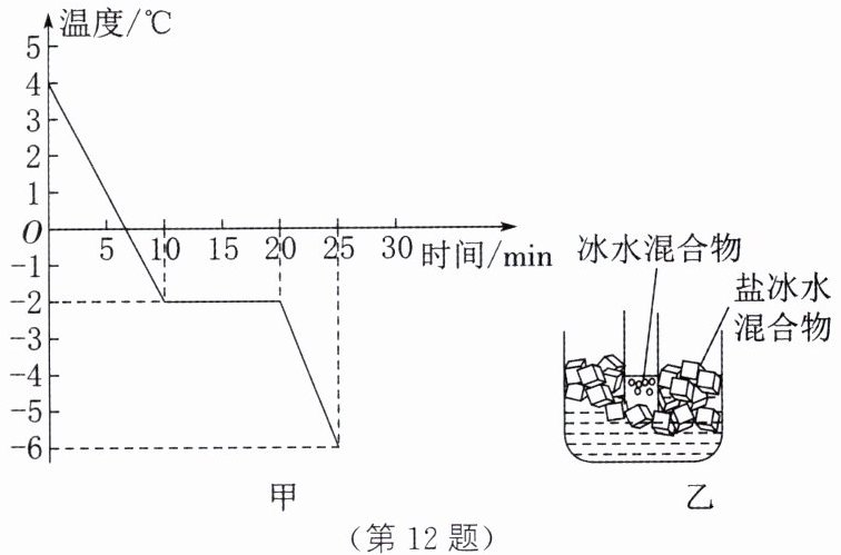 12. 小明同学发现一个现象,严冬季节水缸里的水结冰了,但腌菜缸里的盐水却没有结冰。于是他根据所学的物理知识进行了猜想:盐水的凝固点可能比纯水的凝固点低。为了验证自己的猜想,小明在盛有适量纯水的烧杯中加入适量的食盐并搅拌均匀,把烧杯放入冰柜中,观察盐水的凝固过程,并根据实验数据绘制了盐水的温度随时间变化的图像,如图甲所示。(标准大气压)