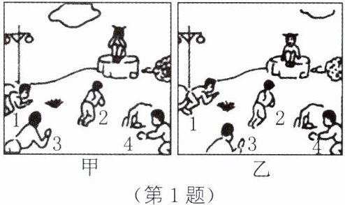 1. 如图所示为游戏“谁在动”中的两个情景,坐在石块上的小朋友先用手蒙住眼睛,松开手后,她发现编号______和______的小朋友发生了机械运动。