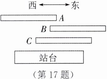 17. A、B、C三列火车在同一个车站,如图所示,A车上的乘客看到B车向东运动,B车上的乘客看到C车和站台都向东运动,C车上的乘客看到A车向西运动,那么站台上的人看到A、B、C三列火车各向什么方向运动?